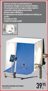 Nee, hoort niet in vraag & aanbod :) Zag in een foldertje van Xenos een leuke aanbieding voor een lichttent met lampen en statief. Ideaal voor productfoto's voor een webshop. Wel een klein tentje 40x40x40cm. Heb zelf al een grote lichttent dus kan niets zeggen over de kwaliteit.