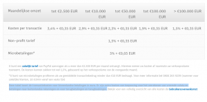 niet helemaal waar... Dat tarief is voor 'binnenlandse betalingen' en voor betalingen vanuit andere landen wordt er soms (flink!) extra gerekend. Lastig te vinden overigens; op deze pagina moet je eerst op 'meer over tarieven' klikken en dan door naar de gebruikersovereenkomst vanuit de popup. Dan kom je op deze pagina met uitleg uit, maar daar staat niks concreets over hoe hoog dat tarief dan is. Dat staat ergens ver onder aan de pagina 'verstopt' onder het kopje Land afzender - Kosten internationale betalingen Noord-Europa - Van 0,4% tot 0,9% Europa I/VS/Canada - Van 0,5% tot 1,0% Europa II - Van 1,3% tot 1,8% Rest van wereld - Van 1,8% tot 2,3% wat dus nog bovenop je commerciele fee komt (wat start bij 3,4% en 35 cent vaste kosten). Wij kwamen hier pas achter toen we uit onze administratie haalden dat er meer naar paypal was gegaan dan begroot; bleek Japan dus gewoon in die 2,3% te zitten waardoor we op een paar bestellingen bijna het dubbele af moesten dragen van wat we begroot hadden...