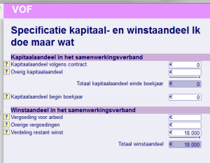 Je kunt volgens mij bij de aangifte (normaal downloadable digitaal O formulier) als onderneming het samenwerkingsverband nemen. Hierop vul je alle gegevens van de vof in. Bij de specificatie kapitaal- en winstaandeel van het samenwerkingsverband vul je het kapitaal en winstaandeel in dat op een van de vennoten van toepassing is.