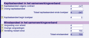 4. Mijn eerste poging voor een vof ::) Uit een kale balans (alles 0 ; de rest weet ik nl. niet) komt een eindvermogen voor de vof van: EV=BV+PS-PO+winst= 0+0-2204+1510= -694 Kapitaal deel volgens contract is -694/2=-347 Verdeling restant winst: 1510/2=755 Als privé opname (auto) moet 1102 ingevuld worden. succes