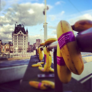 Hallo, in Rotterdam duiken de afgelopen twee dagen duizenden bananen met stickers op. De bananen zijn door heel Rotterdam gespot, o.a. op de Coolsingel, het Stadhuis, de Erasmusbrug, Kop van Zuid en zelfs op de Euromast. Waar de bananen vandaan komen, is niemand bekend. Iedere banaan heeft een QR code die linkt naar de Facebookpagina 'Waar Komt Die Banaan Vandaan?' waar mensen flink speculeren over de actie. Ook op Twitter en zelfs de Rotterdamse radio is de discussie flink op gang. Weet iemand van jullie wat hier achter zit? Ik ben wel benieuwd. http://www.facebook.com/pages/Waar-komt-die-banaan-vandaan/453709344675957