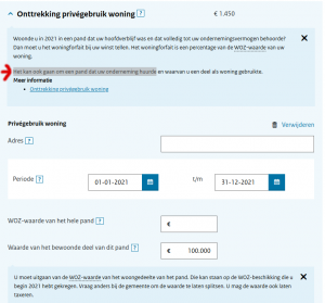 13. De IB belastingaangifte werkt toch sterk de indruk dat ze dezelfde informatie willen hebben van zowel kopers als huurders. ("Het kan ook gaan om een pand dat uw onderneming huurde") Concreet willen ze daarbij weten wat de (getaxeerde) waarde van het woningdeel is, en komt daar automatisch het forfait als correctie uit, zonder dat je hier een afwijkend kostenbedrag in kan vullen. Bijv. 100.000 EUR is altijd 1450 EUR correctie. (Let wel op dat dit "woning forfait" in het kader van de ontrekking privegebruik woning, niet het welbekende "eigenwoningforfait" is waar alle huizenbezitters mee te maken hebben. Wat wellicht ook bij sommigen voor verwarring kan zorgen).