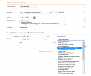Easy does it, Ik vroeg: "Maar hoe boek ik dat dan in mijn boekhoudprogramma? Als privéstorting?" maar begrijp je laatste antwoord niet helemaal. Mijn vraag ging over dit stuk tekst van jou: Over dat "Je boekt ontvangsten op de zakelijke spaarrekening (1030) tegen op de privé rekening 1020." volgens mij bedoel je dat ik dan dit doe? (zie afbeelding) Maar hier kan ik de grootboekrekening 1030 niet kiezen!