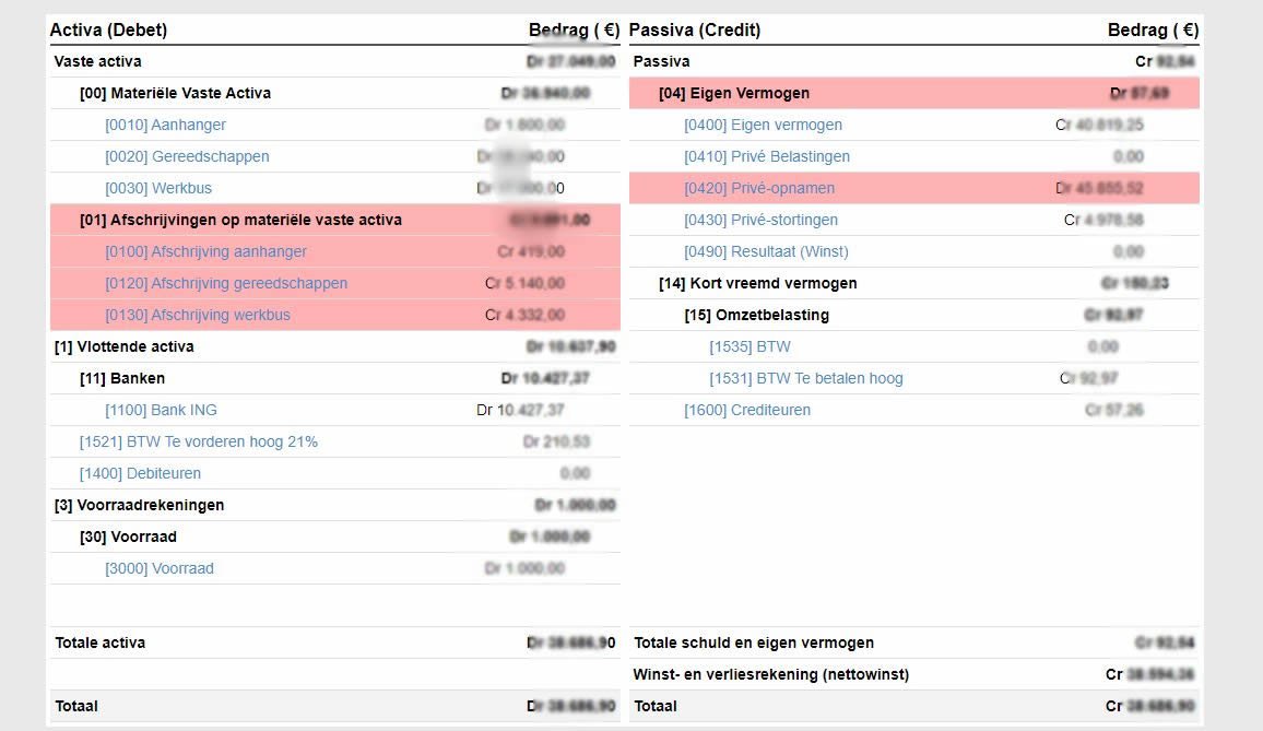 IK rijd met auto van de zaak minder dan 500km per jaar bijv. 462 (ritten registratie) Gegevens ingevoerd https://www.belastingdienst.nl/wps/wcm/connect/nl/btw/content/hulpmiddel-btw-en-de-auto Uitkomst Het te betalen btw-bedrag voor privégebruik van de auto is € 13. -aangifte. Vul dit bedrag in bij de rechterkolom van rubriek 1d 'Privégebruik' van uw btw Vul in de linker kolom van rubriek 1d het bedrag € 66 in. Voor mijn kosten krijg ik 244,44 terug , te betalen is er niet Een grootboek [0415] Privé Btw aangemaakt op balans onder eigen vermogen. Boek ik: Bij/AfGrootboek Debet ( €) Credit ( €) Bij[1535] BTW Dr 232,00 Af[1521] BTW Te vord. hoog 21% Cr 244,44 Af[9100] BTW verschil Cr 0,56 Bij[0415] Prive Btw Dr 13,00 Cr Totaal Dr 245,00 Cr 245,00 Vragen Is de boeking correct? [0415] Prive Btw heb ik op balans onder privé vermogen, klopt dit , al van alles gelezen ook te plaatsen onder W&V? De 13 euro worden in mindering gebracht, de 66,- (Linker kolom van rubriek 1d ) zijn dat inkomsten ?, ook gelezen dat je onder de 500km met inkomstenbelasting geen rekening hoeft te houden. Overigens: Ik kan hier geen tabel aanmaken, eerder kon dat wel iemand een idee?